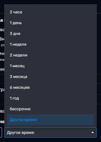 - Далее следует настройка срока бана, по умолчанию доступно 10 вариантов: «2 часа», «1 день», «3 дня», «1 неделя», «2 недели», «1 месяц», «3 месяца», «6 месяцев», «1 год» и «бессрочно».