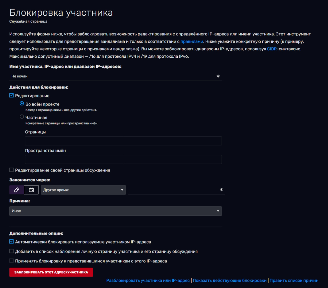 - Так же как и сроки, список стандартных причин можно редактировать: для этого предусмотрено сообщение MediaWiki:Ipbreason-dropdown.