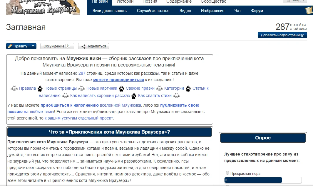 Представляет собой объединение проектов Сборник рассказов и Мяунжик Вики, вплоть до 17 августа 2017 существовавших отдельно друг от друга.
