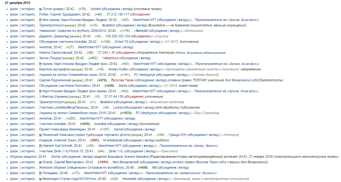 - Вся история редактирований и прочих действий участников сохраняется на страницах истории и журналов.