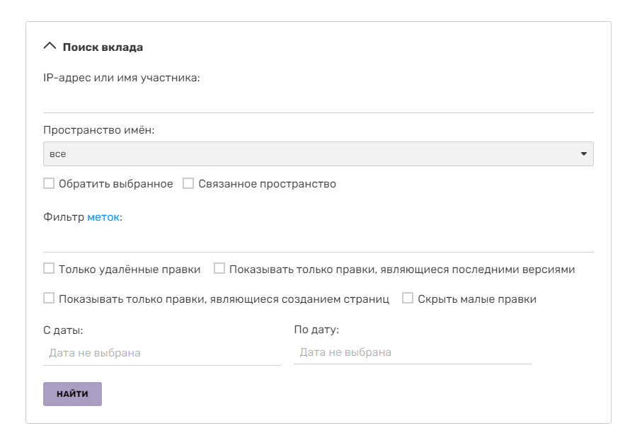 В разделе «Поиск вклада» присутствуют поле «IP-адрес, или имя участника», куда вводится никнейм или адрес IP определённого участника, выбранного для просмотра вклада. Ранее там существовала опция «Показать вклад, сделанный с новых учётных записей», которая являлась альтернативой Свежим правкам, но была убрана в угоду последних. Также можно упорядочить поиск: