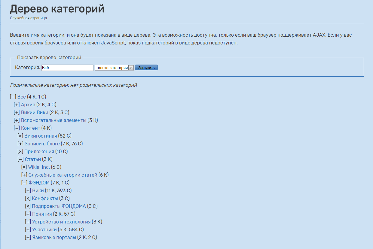 Под описанием находится блок «Показать дерево категорий», содержащий поле для ввода названия просматриваемой категории, фильтр и кнопку «Загрузить», после нажатия которой формируется дерево. В фильтре можно выбрать опции «только категории», «кроме файлов» и «все страницы».
