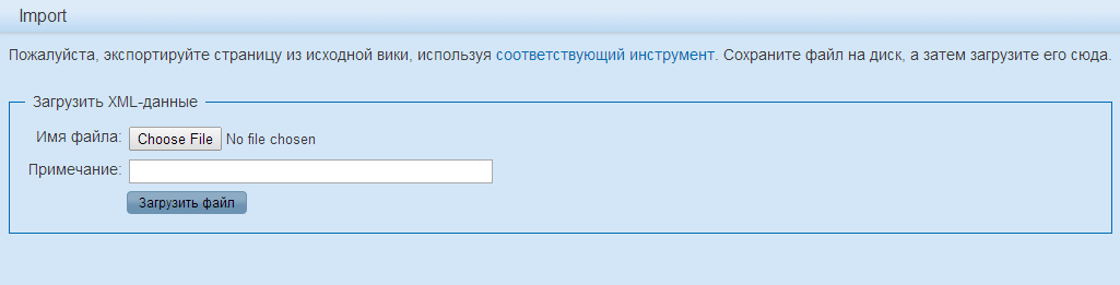 Для совершения импорта страниц требуется загрузить на вики-получатель файл в формате XML, содержаший экспортированный контент вики-источника.