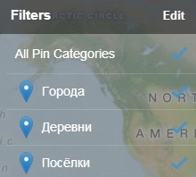 Даже после того как карта была создана, к ней всё ещё было можно добавлять новые категории точек, а также редактировать и удалять уже созданные. Все категории точек были перечислены в столбике под названием «Filters» (рус. Фильтры). Там читатели могли выбрать, точки каких категорий они хотели бы просматривать.
