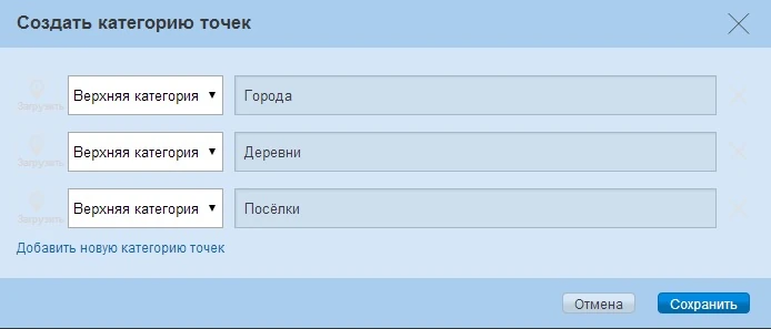 Вне зависимости от типа создаваемой карты — реальной или своей, после создания карты также требовалось создать категории для её точек. Чтобы сделать это, нужно было в соответствующей графе указать название для категории. Также была возможность нажать на кнопку «Загрузить», чтобы при желании добавить для категории изображение. Оптимальный размер для изображений — 60x60 пикселей. Для создания карты требовалось обязательно создать как минимум одну категорию. Чтобы сделать ещё, нужно было нажать на кнопку «Добавить новую категорию точек».