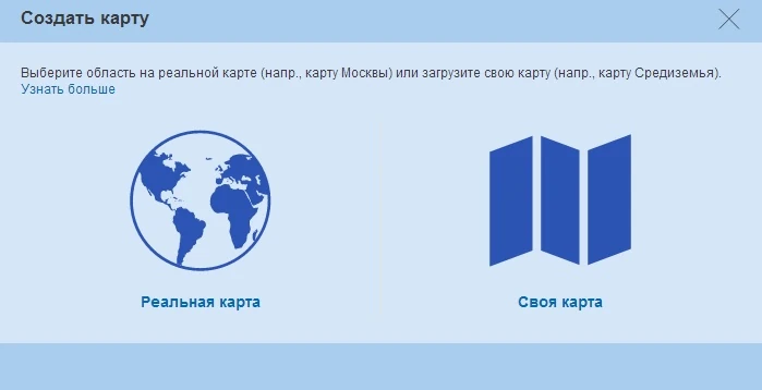 В открывшемся окне предлагалось выбрать требуемый тип карты — «Реальная карта» или «Своя карта». Эти два типа имели разные свойства и предназначения.