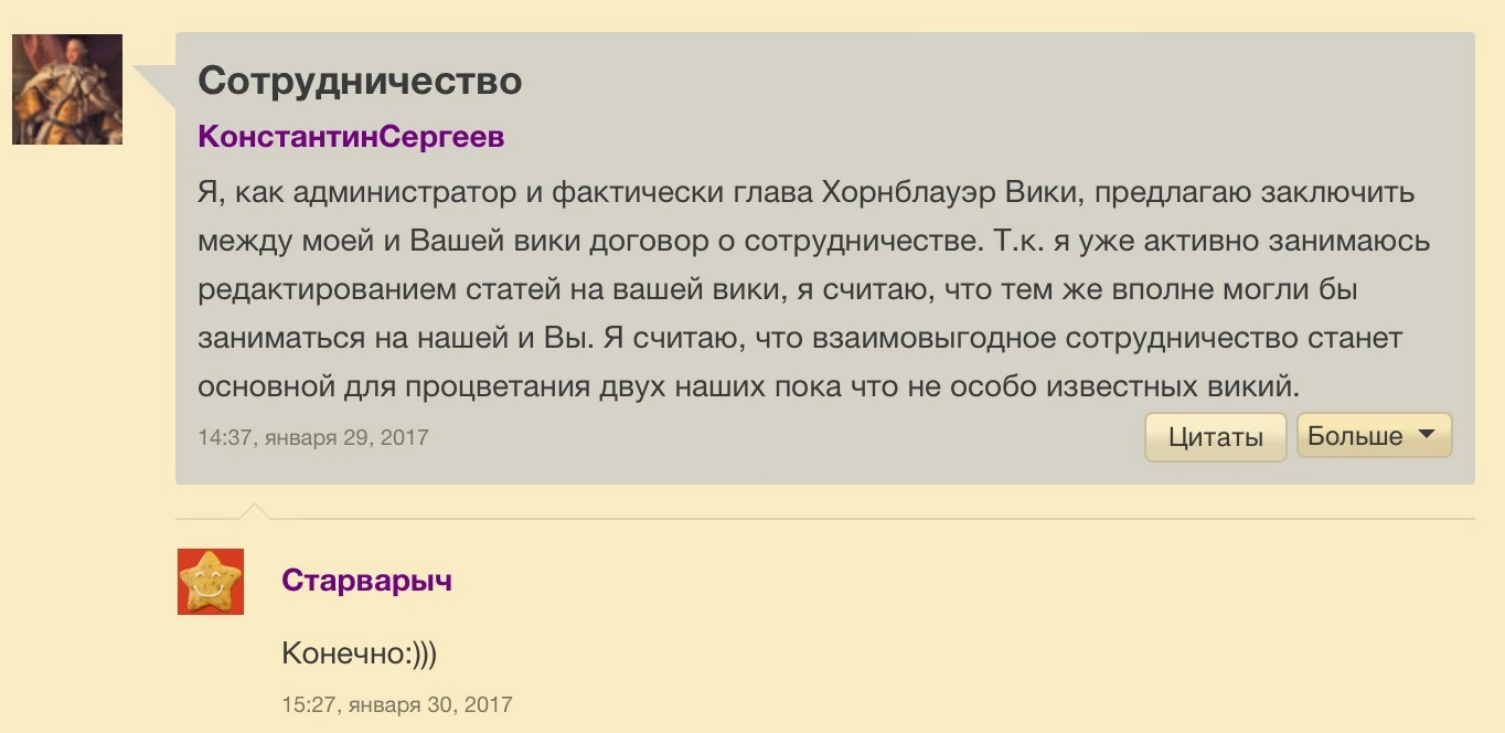 Сообщение на стене Старварыча о сотрудничестве двух проектов