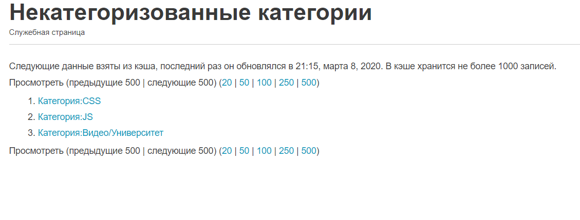 В самом верху страницы содержится информация о том, когда в последний раз обновлялся список (обновление происходит примерно 1 раз за день) и о том, что пользователю доступны только первые 1 000 записей списка. В самом списке находятся ссылки на категории, которые не включены ни в одну из других категорий.
