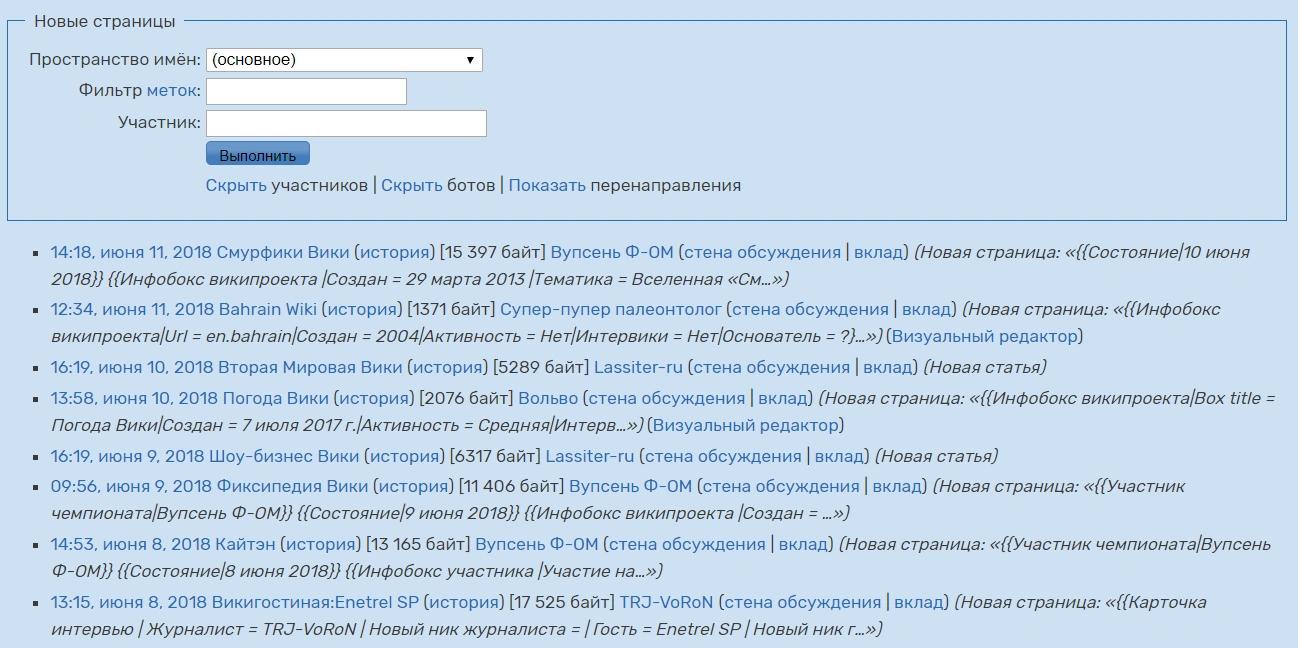 Ниже таблицы с параметрами находится список страниц, которые удовлетворяют указанным ранее параметрам. По умолчанию участник видит все статьи из основного пространства за последние три месяца или за более короткий период времени, если на вики было создано много новых страниц (точное число неизвестно; примерно более 6 000).