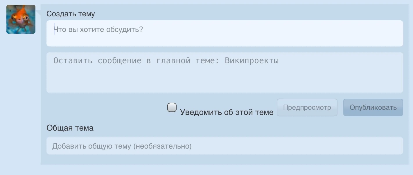 - В центральном поле нужно написать текст сообщения, после чего нажать на «Опубликовать». Перед публикацией можно взглянуть на свою тему через предпросмотр, воспользовавшись соответствующей кнопкой. При желании пользователь может добавить общую тему, то есть ввести название статьи, к которой относится данная тема. В таком случае, ссылка на обсуждение появится в связанных статьях. Ввести название можно только существующей статьи в окошке ниже. Администраторы и модераторы также могут оповестить всех участников о своём сообщении, поставив галочку возле «Сообщить об этой теме».