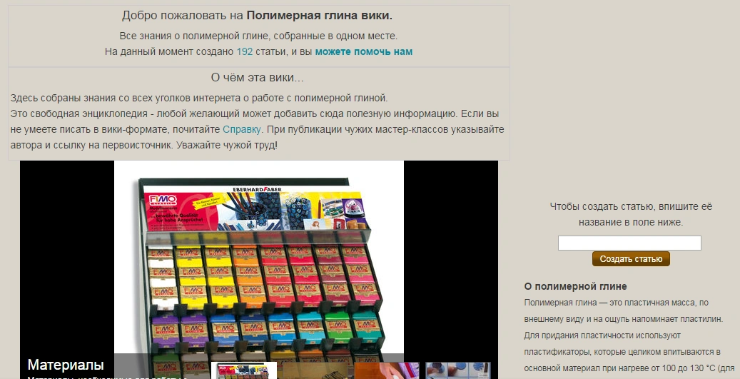- Статьи про материалы — самые большие статьи на проекте, описывают основные материалы для работы с полимерной глиной — краски, клей, саму глину и про прочие[8].
