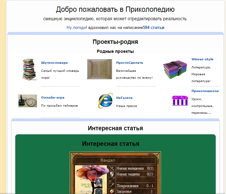 Заглавная была хорошо оформлена, состояла из приветствия, разделов «Проекты-родня», «Интересная статья», «Интересные факты» и «Реклама!».
