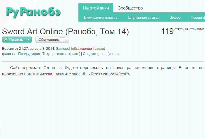 Однако, в августе 2014 участники РуРанобэ приняли решение о переносе проекта на независимый сервер и единодушно покинули его версию на Фэндоме. Был создан сайт http://ruranobe.ru/, также функционирующий на движке вики, но, в отличие от сайтов Викия, открытый для редактирования только определённым пользователям (такой тип проектов вне Викия часто называют «окукленными») и имеющий особое оформление. На новый сайт были перенесены все старые статьи-переводы. 8 августа 2014 Samogot заменил текст всех статей проекта на Фэндоме (которых было написано около 100) на фразу «Сайт переехал. Скоро вы будете перенесены на новое расположение страницы. Если это не произошло автоматически, нажмите здесь» (под словом «здесь» находилась ссылка на соответствующую статью на новой версии сайта), при этом добавив также код, автоматически перенаправляющий на новый сайт[6]. За код отвечала страница MediaWiki:Redir, которая впоследствии была удалена помощниками Викия[7] (сам код добавлялся в статьи через тег verbatim).