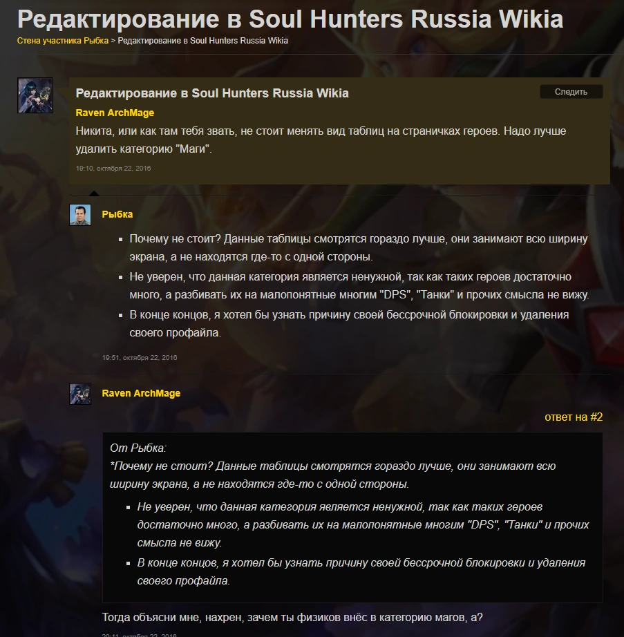 Однако, вклад Рыбки на Soul Hunters Wiki не был долгим — вскоре на проект вернулся его основатель Raven ArchMage, которому не понравились правки участника[162], в связи с чем 24 октября 2016 года Рыбка был навсегда заблокирован[163]. В конфликт между основателем проекта и Рыбкой попытался вмешаться помощник Kopcap94[164], но это не дало никакого эффекта: блокировку не сняли, из-за чего Рыбке дали новое задание для прохождения отбора на пост помощника (через несколько дней он отправился дополнять Цивилопедию).