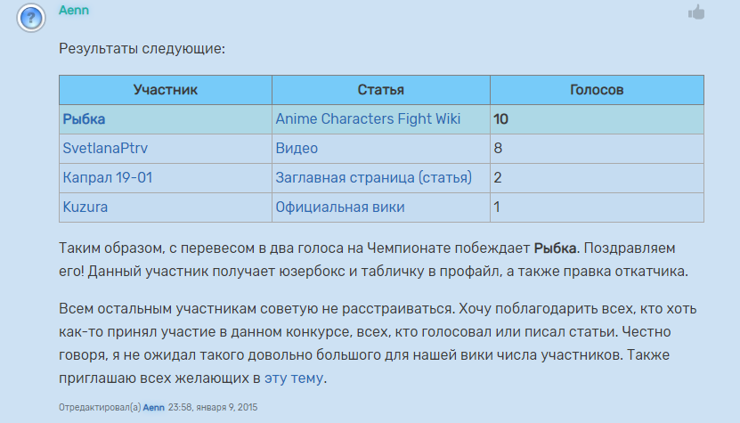 В декабре 2014 года на проекте стартовал первый чемпионат по написанию статей[68]. Рыбка принял участие в чемпионате, для первого тура он написал статьи «Warframe Wiki»[69] и «Рома Омич»[70]. В первом туре Рыбка набрал 10 голосов участников и сумел пройти в финал[71], для которого он написал статью «Anime Characters Fight Wiki»[72]. Рыбка одержал победу в финале, набрав 10 голосов участников и обогнав ближайшего конкурента, Fion’у of Amber на два голоса[73]. Через некоторое время после чемпионата были проведены голосования о присвоении написанным по его ходу статьям Рыбки статуса избранных, по результатом которого они все были удостоенных данных званий[74].