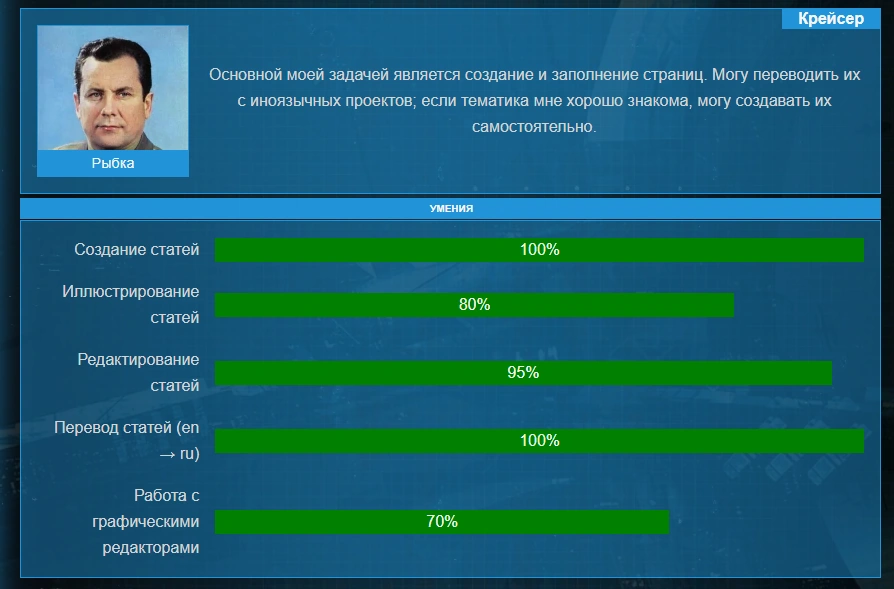 - ↑ Рыбке выдают статус администратора на Кости Вики как работающему над проектом члену Эскадры