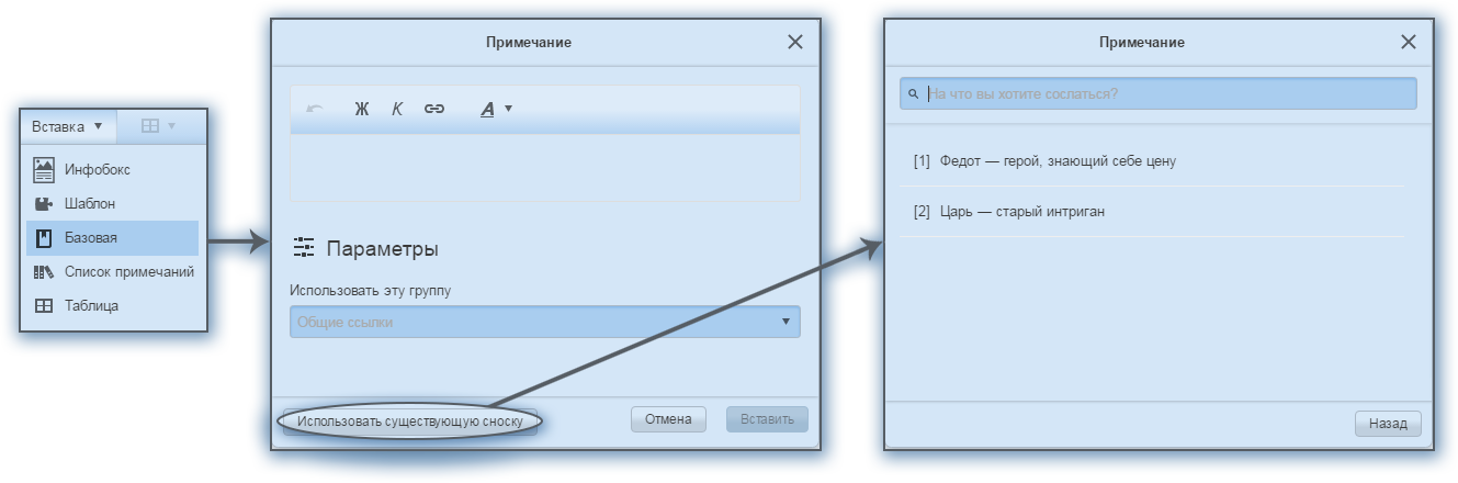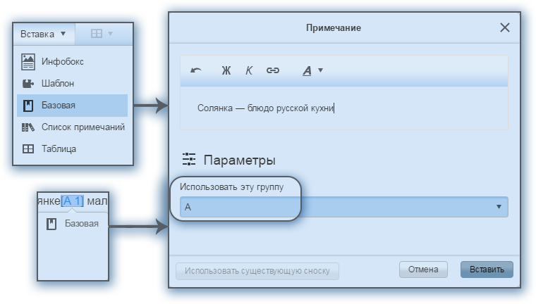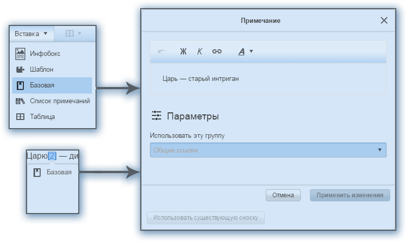Для проставления стандартной сноски в новом визуальном редакторе необходимо установить курсор в нужном месте текста, выбрать на панели инструментов Вставка → Базовая и в появившемся окне написать текст сноски. В режиме редактирования сноска будет отображаться в виде большой цифры в квадратных скобках, однако после сохранения примет стандартный надстрочный вид. Отредактировать уже написанное примечание можно, нажав на цифру и выбрав в выпадающем меню единственный имеющийся пункт Базовая.
