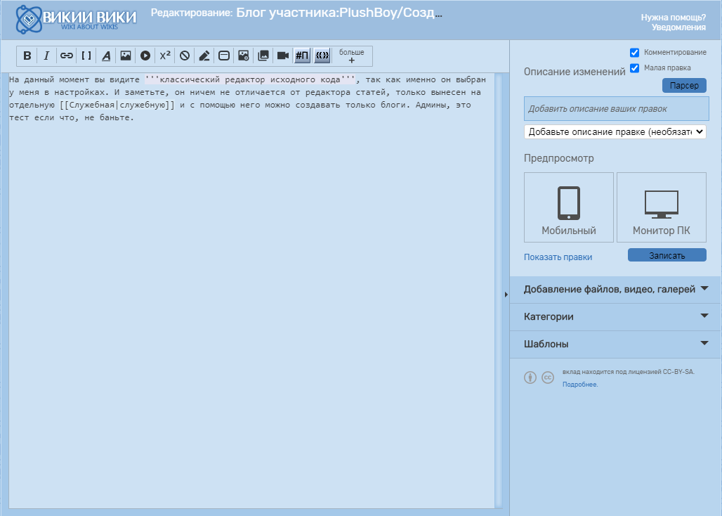 Служебная «Создать новую страницу» — единственный способ создания блога на старой платформе. Своих преимуществ и недостатков она не имеет (за исключением, пожалуй, возможности сменить название блога по ходу редактирования), так как не имеет альтернатив и фактически является обычным редактором, мало чем отличающемся от редактора статей.