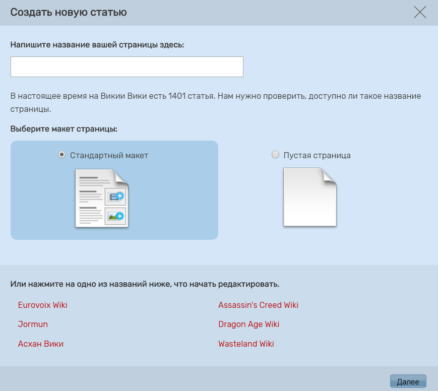 - Форма кнопки «Создать новую статью», равно как и метод адресной строки, не позволяет использовать в названии префикс интервики, связывающей Фэндом со сторонним сайтом (например, wikipedia:ru). Однако со служебной «Создать новую страницу» это возможно, и записанный текст также можно будет посмотреть постфактум.