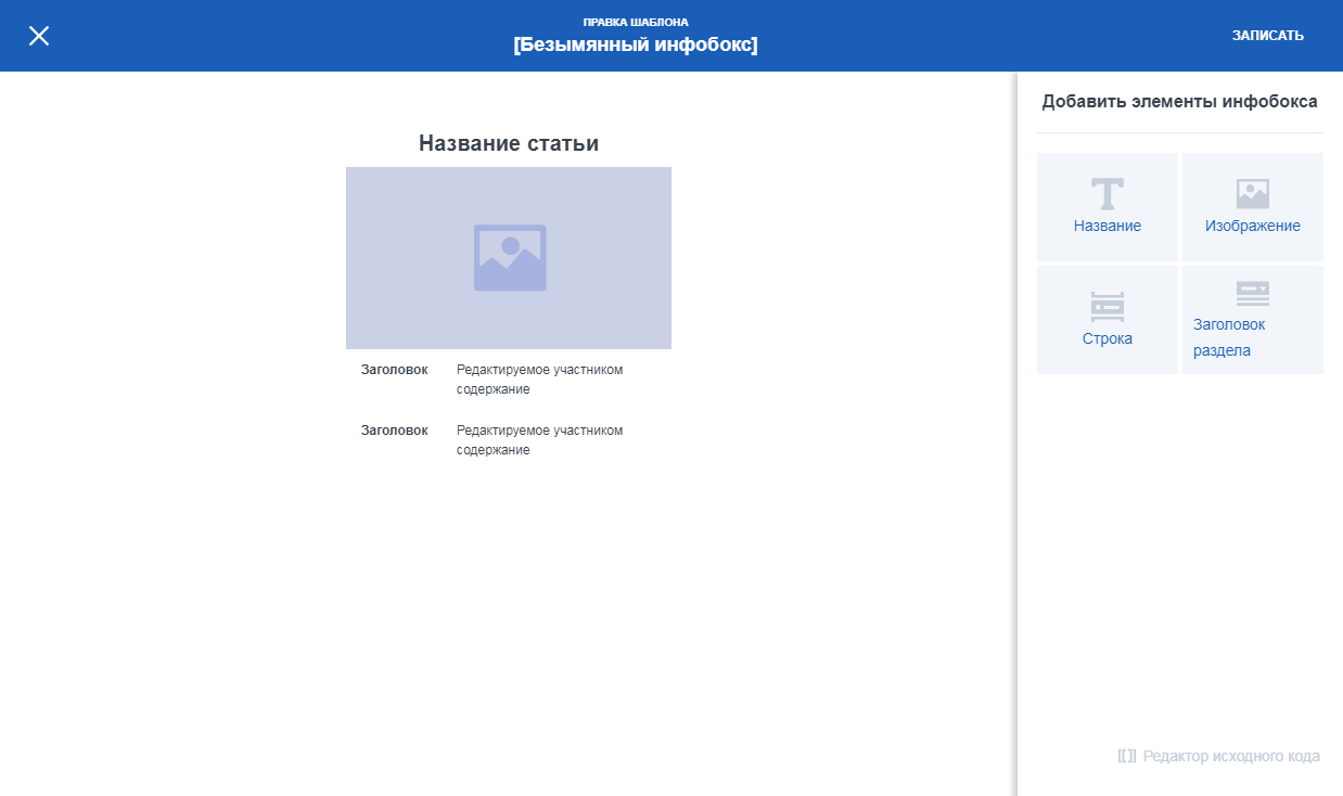 - При создании страницы шаблона предлагается выбрать его тип. Если после этого выбрать «Инфобокс», откроется конструктор инфобоксов, из которого, однако, можно вернуться в классический исходный код.
