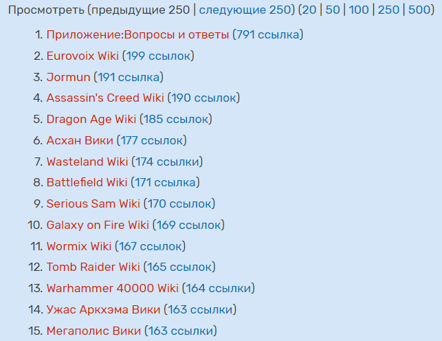- «Требуемые страницы» (Служебная:WantedPages) и «Исследования» (раздел «Требуемые страницы») — показывают красные ссылки на статьи;