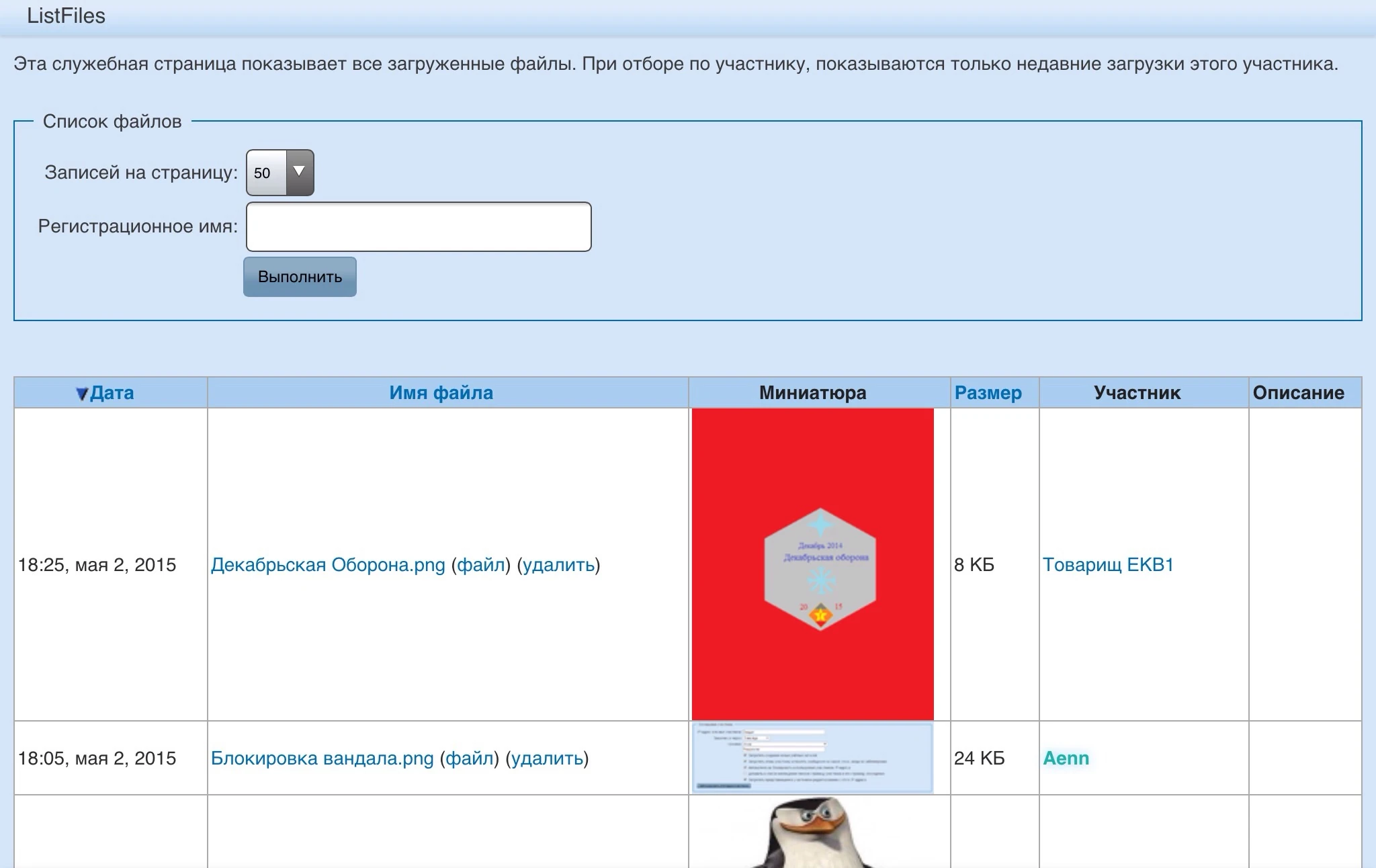 - Имя файла — в данном столбце находится название файла, которые было присвоено его автором. Левее названия только у администраторов находится кнопка, с помощью которой можно удалить файл. При нажатии на названии колонки участник может отобрать все существующие изображения, введя название файла;