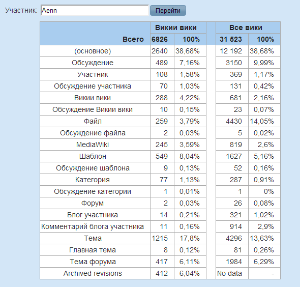 Появится большая таблица, по вертикали разделённая на два раздела: касающийся вклада на данной вики и касающийся вклада на хостинге в целом. Таблица показывает не только общие цифры, но также сведения по конкретным пространствам имён и процентные соотношения.