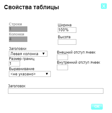 Для того чтобы создать таблицу с использованием классического визуального редактора, нужно нажать на кнопку таблицы справа от области редактирования. После этого появится небольшое окно для задачи параметров, как то: