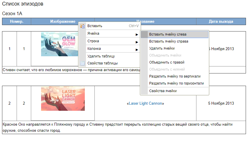 Если после добавления таблицы в неё потребуется какие-либо изменения, достаточно нажать на неё правой кнопкой мыши и во всплывающем окне выбрать необходимую опцию (можно работать с ячейками, строками и столбцами; также можно изменить ранее описанные свойства таблицы, а в случае необходимости — и вовсе удалить её).