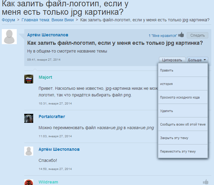 - «Удалить» — удалить тему. Доступно только автору темы, модераторам обсуждений и администраторам.