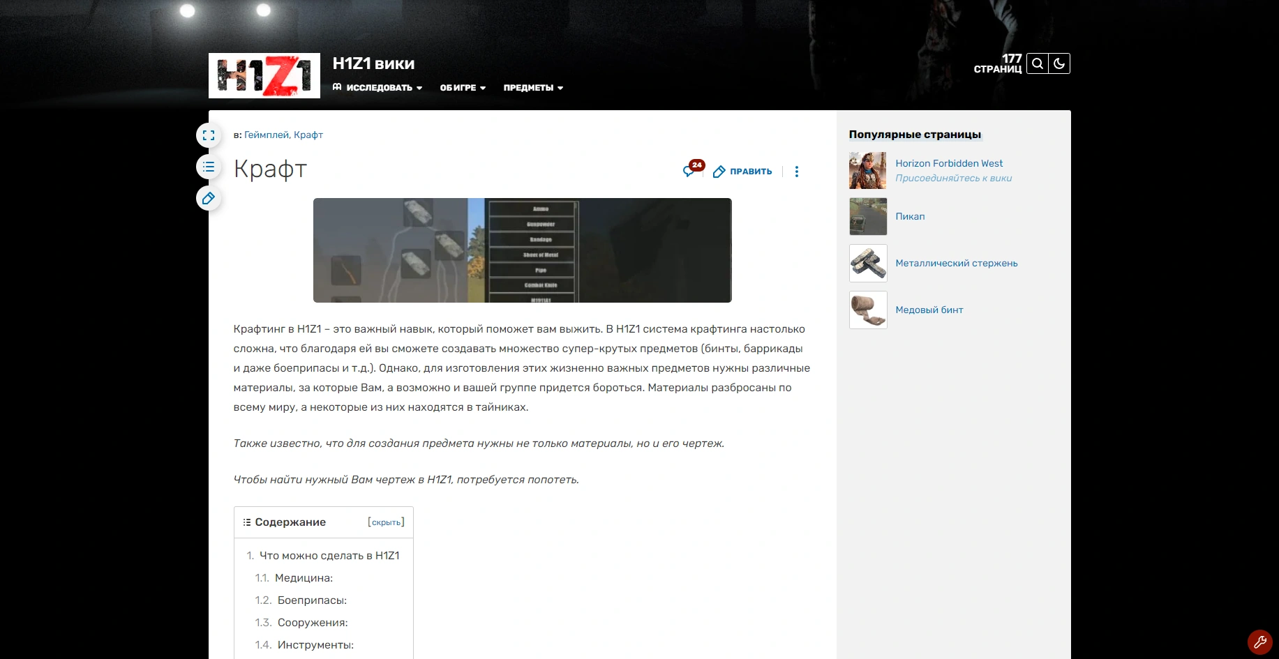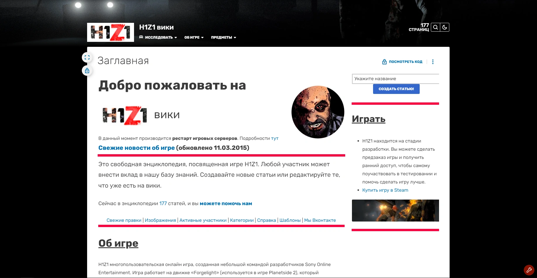 С технической стороны, википроект также не является таким уж и развитым. H1Z1 Wiki была зарегистрирована во времена оформления «Oasis». И как в случае с подобными неактивными проектами, последний, так и не был полноценно адаптирован под «FandomDesktop». Также можно отметить, что википроект содержит в себе неактуальный CSS-код, который уже долгое время не работает.