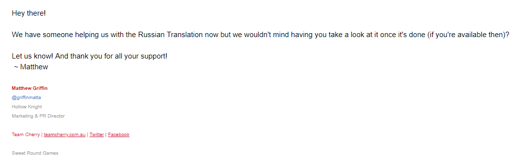 В конце июня 2017 администратор WingdingAster0 решил написать непосредственно разработчикам игры о предложении ввести в игру русский перевод, сделанный на бескорыстных началах. На письмо ответил PR-менеджер Team Cherry (разработчики игры) Мэттью Гриффин: от помощи разработчики отказались. Как бы то ни было, ответ хоть и был отрицательным, он прояснил самое важное: работа над официальным переводом всё же идёт, хоть и в медленном темпе.