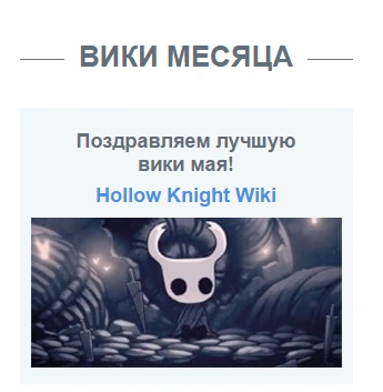 В мае 2017 года Hollow Knight Wiki стала номинантом в конкурсе «Вики Месяца»[54]. Вики выиграла со счётом в 30 голосов на Вики Сообщества и 202 голоса в голосовании ВКонтакте. По словам бюрократа WingdingAster’а0 в его интервью на Викии Вики[55], после победы его подопечной вики правила касательно конкурса были изменены коренным образом. Участника крайне обрадовал тот факт, что спустя несколько месяцев голосование ВКонтакте было полностью отменено, а ведь оно, по мнению бюрократа, изначально было «дурно пахнущей идеей»: «Меня особо напрягло количество голосов: даже во время борьбы куда более популярных вики голосование ВК не набирало такое количество. Делаем выводы сами». Администратор также положительно высказался о факте, что именно победа его вики заставила устраивающих конкурс пересмотреть правила: