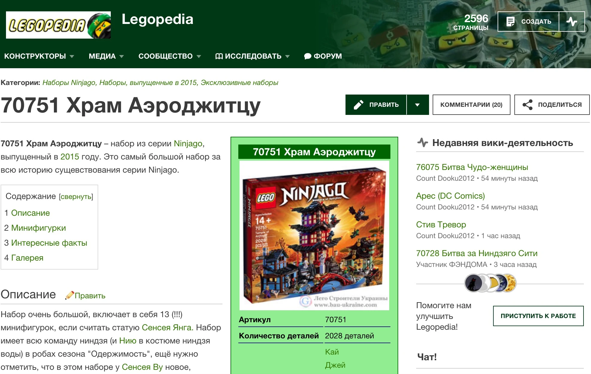 На данный момент одной из самых крупных вики на эту тему является англоязычная Brickipedia, насчитывающая более 10 000 статей.