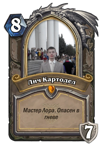 Первым аватаром участника являлась сделанная при помощи специального сайта карта героя из игры Hearthstone, правда, из-за ограничения на размер низ изображения с описанием срезался. Фотография для карты взята из личного архива — по словам участника, это одно из лучших фото со ним.