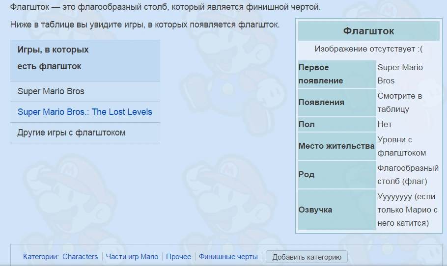 Mario Wiki — малоактивный русскоязычный википроект, посвящённый серии игр Mario и имеющий .