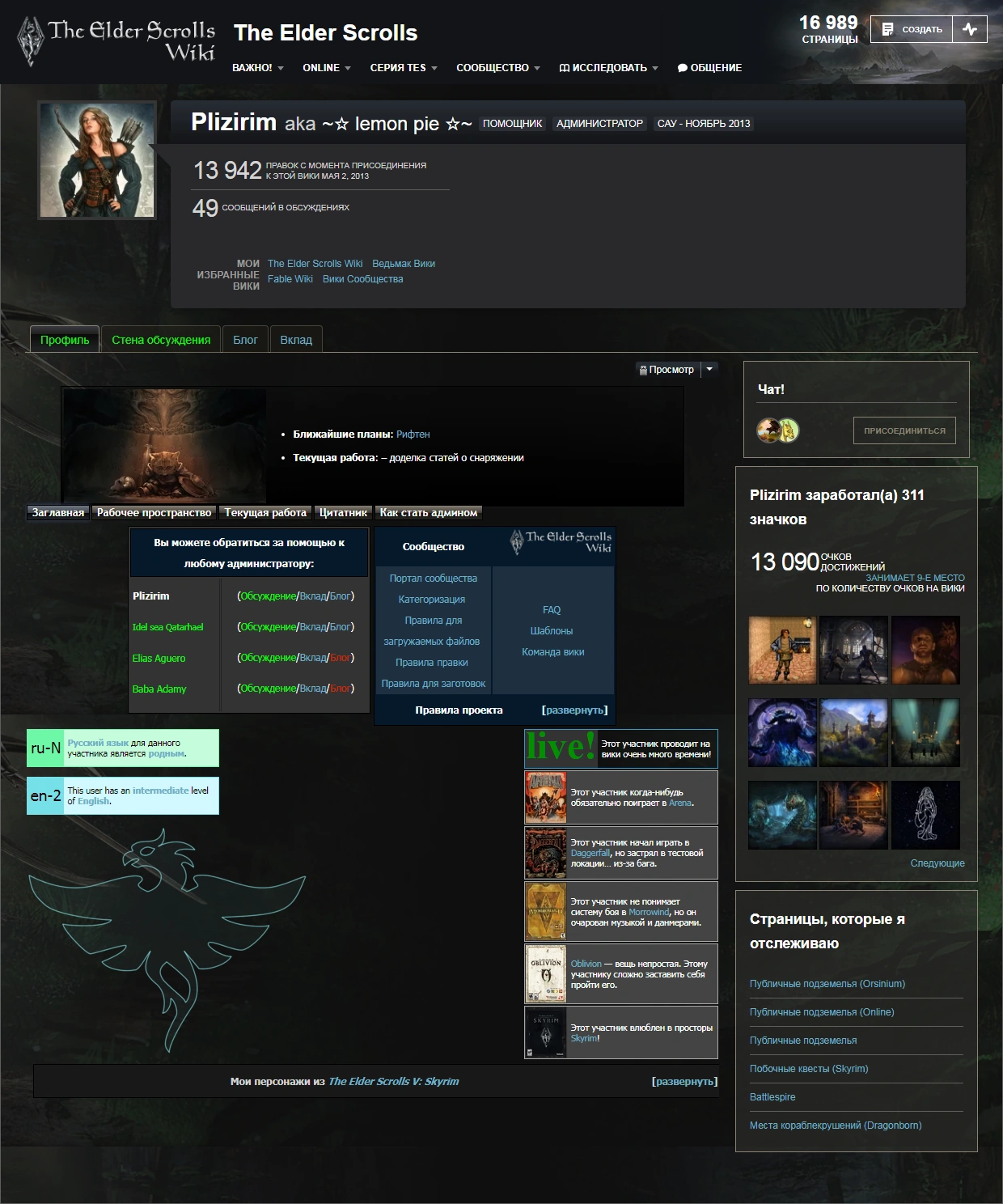 Профайл на Ведьмак Вики, с дополнительными вкладками.
