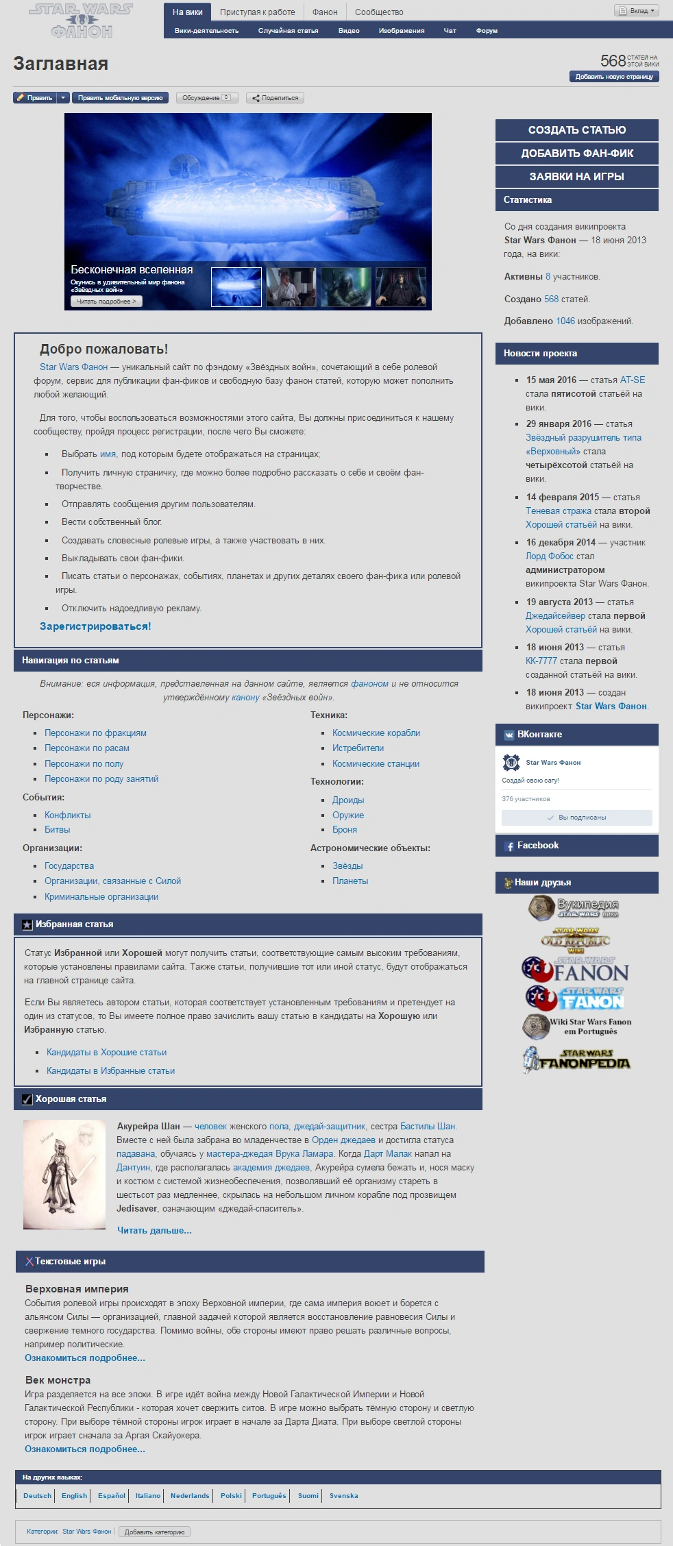 В настоящее время, Заглавная страница состоит из нескольких блоков, включая красочный слайдер, рамку с приветствием и краткой информацией о проекте, навигационную зону, блоки с ссылками на Хорошие и Избранные статьи, а также на действующие ролевые игры. Помимо этого, в колонке справа имеются ссылки на справочные статьи по созданию страниц, публикации фан-фиков и подаче заявок на ролевую игру. Ниже расположен блок с некоторыми статистическими данными проекта, к примеру, количеством активных участников и добавленных изображений. Далее размещена колонка новостей вики, ссылка на группу в социальной сети ВКонтакте и перечень официальных викидрузей, в число которых входят русскоязычные Вукипедия и SWTOR Вики, а также другие проекты Star Wars Fanon на английском, польском и португальском языках.[7] Из элементов Wiki Features подключены голосования, блоги, списки TOP-10 и чат. Ранее также были подключены новые стены обсуждения, однако их позже убрали с целью сохранить схожесть в Вукипедией[8]. Регистрация пользователей на проекте является обязательной.