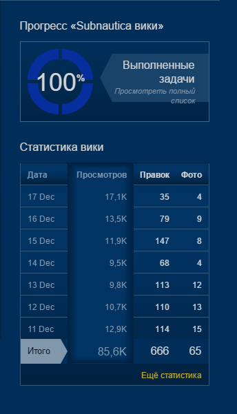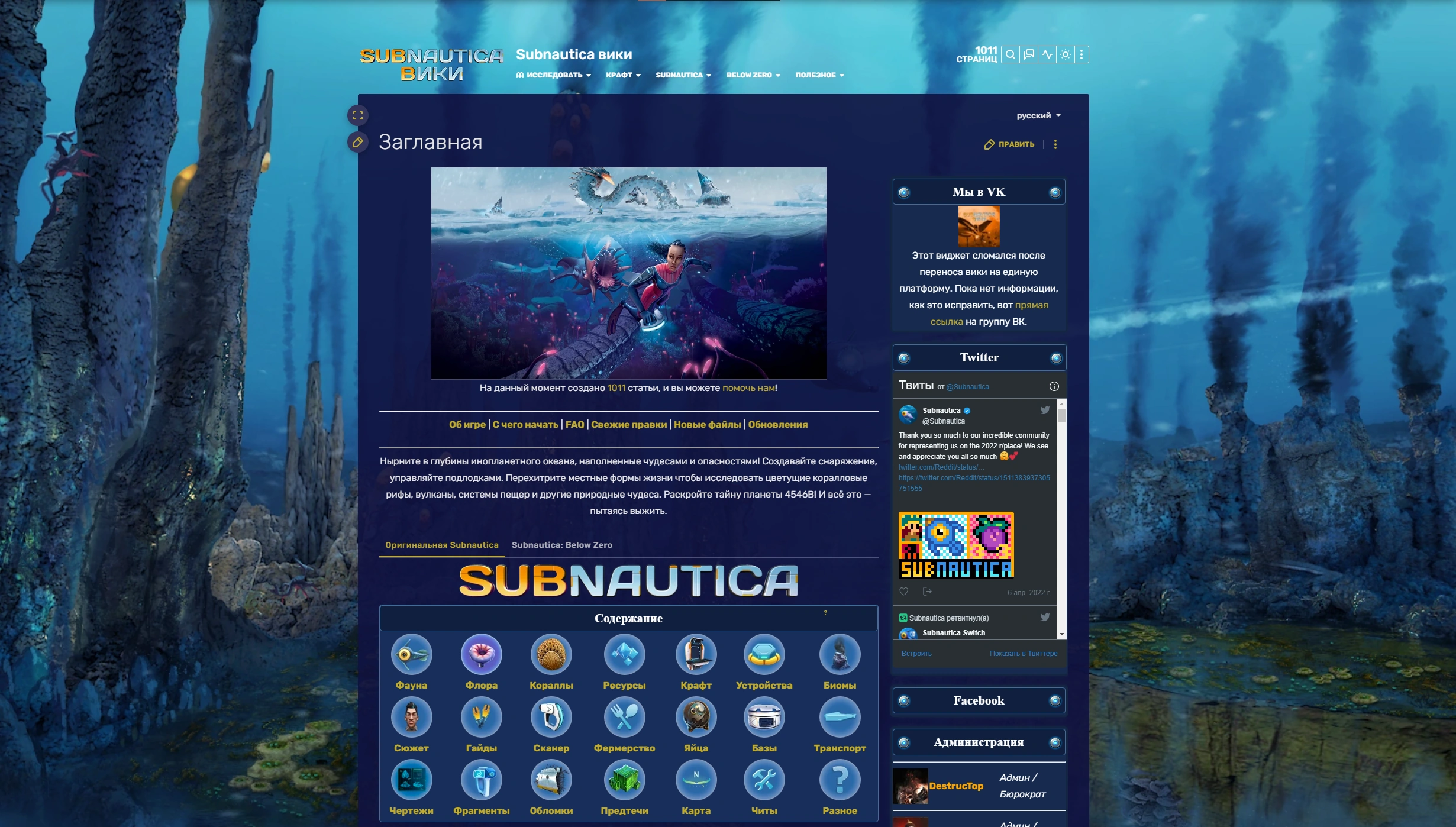 - ↑ Несмотря на лидерство русскоязычной вики по данному показателю следует учесть определяющий в данном случае фактор — Subnautica: Below Zero. В случае подсчёта статей с двух англоязычных проектов их суммарное количество превысит 1 000 единиц, в то время как на русскоязычном проекте, освещающим всю вселенную Subnautica, более чем на 100 статей меньше