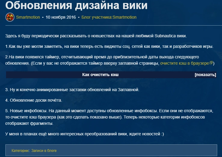 | « | Присоединился я к Subnautica wiki 27 мая 2015, тогда я искал хорошую Вики по новой, не очень популярной игре..