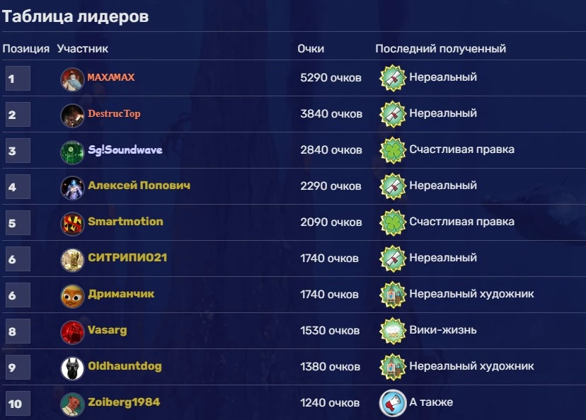 В апреле заметный вклад внесли Алексей Попович[65], который до этого проявлял в основном эпизодическую активность, и Lonely Costello[66], который зарегистрировался на Subnautica Wiki 16 апреля[67]. Также среди активистов вики в апреле можно выделить её завсегдатаев DestrucTop’а и Smartmotion’а, и активно проявляющего себя в последние месяцы Zem’уRU.