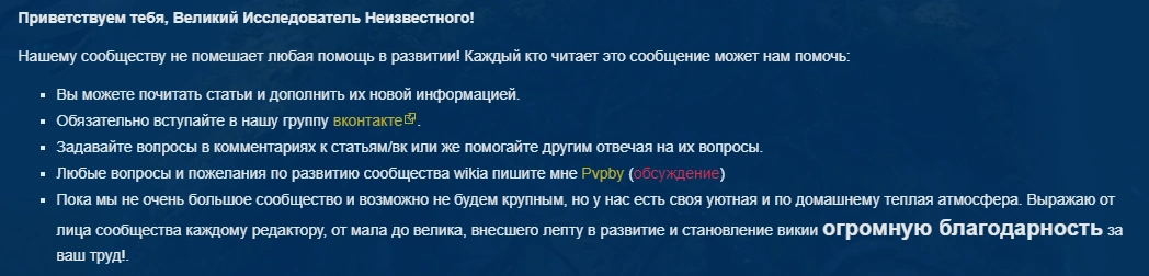 Эта была единственная на то время русскоязычная вики по Subnautica, статей тут было мало, часть из них были просто скопированы из англоязычной вики... Я тогда с моим запасом знаний решил перевести одну статью, дабы помочь этой маленькой вики... Но потом, через месяц я вспомнил про эту вики и про эту прекрасную игру, и начал активно тут работать. Мне нравиться помогать людям, ведь когда человек незнающий ничего о этой игре приходит сюда, чтобы получить знания ,наш долг - предоставить ему понятные, удобные в навигации статьи... |