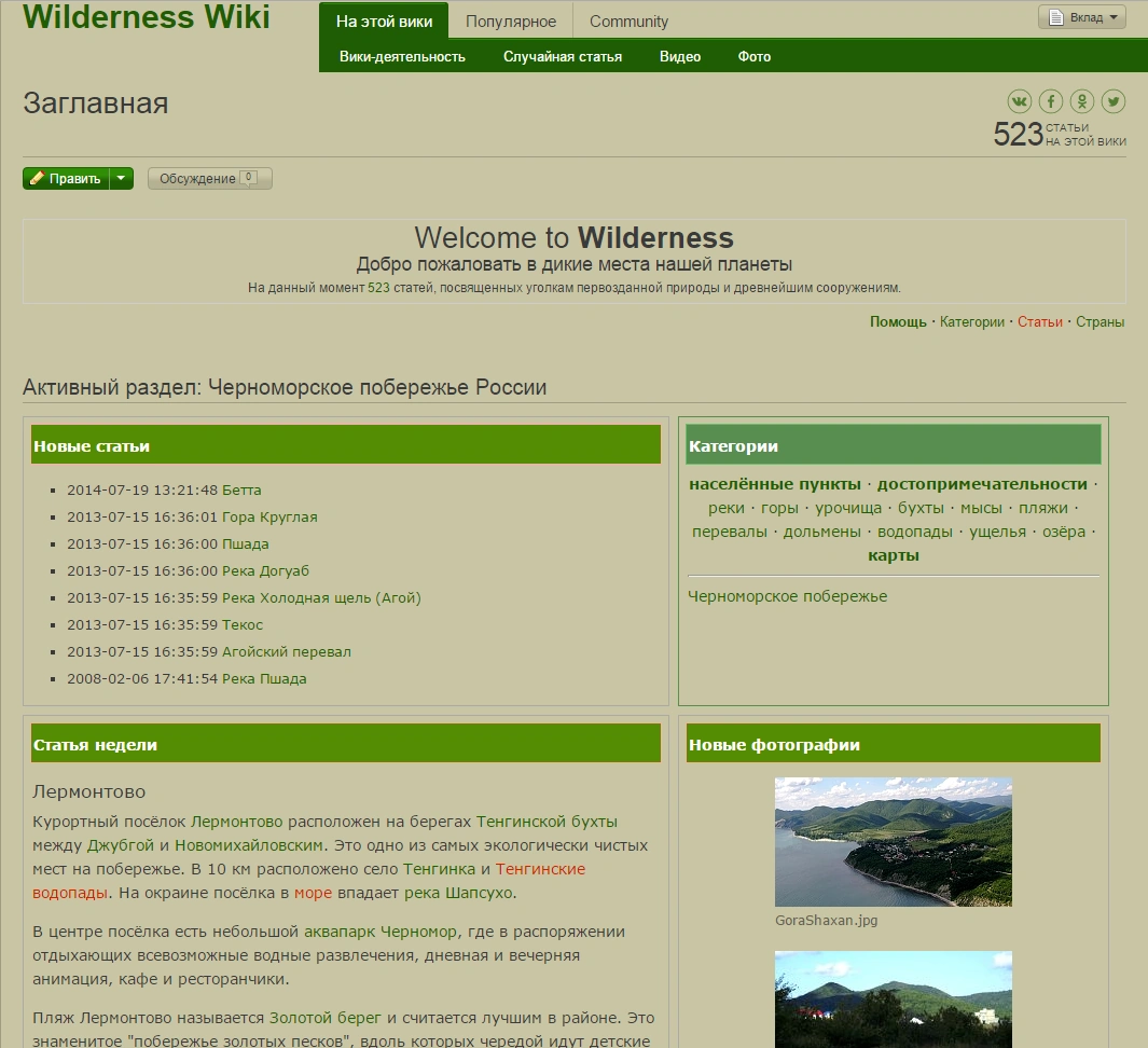Проект расположен на домене ru.wilderness.wikia.com. Так как проект был давно основан, и единственный администратор очень долгое время неактивен, то на проекте нет ни логотипа, ни уникального фавикона. В качестве фона используется стандартная зеленая заставка. Заглавная страница выглядит очень просто: она состоит из блогов и ссылок на некоторые статьи.